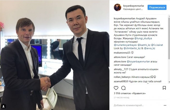 "Андрей Аршавин - один из моих любимых футболистов. Он не только прекрасный футболист, но и, как оказалось, хорошо шутит. В столицу он приехал, чтобы сыграть с "Астаной", но успел и к нам в студию. Ждите, скоро в эфире "Түнгі студия", - написал Коянбаев.