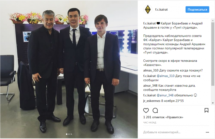 "Председатель наблюдательного совета ФК "Кайрат" Кайрат Боранбаев и полузащитник команды Андрей Аршавин стали гостями популярной телепередачи "Түнгі студия", - подписан снимок в Instagram.