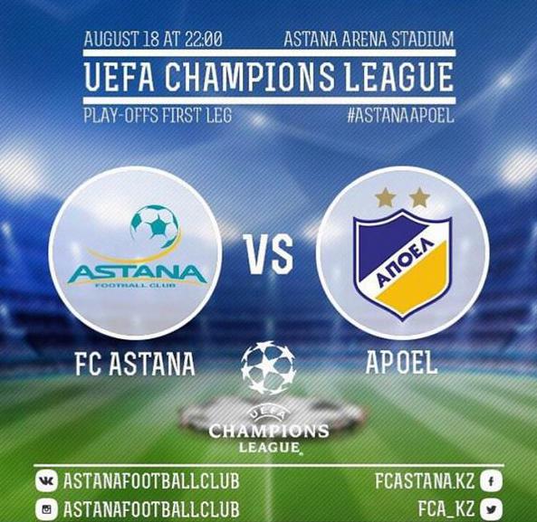 18 августа на столичном стадионе "Астана-Арена" состоится первый матч раунда плей-офф Лиги чемпионов между "Астаной" и кипрским АПОЭЛом. Игра начнется в 22.00 по местному времени. В прямом эфире ее покажет телеканал "Тан". Ответная игра между командами состоится в ночь с 26 на 27 августа в Никосии.