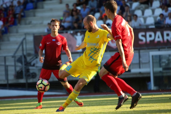 Первая игра второго раунда квалификации прошла сегодня, 12 июля, на стадионе "Слока" в Юрмале и завершилась со счетом 0:1. В первом тайме подавляющим преимуществом владели футболисты "Астаны", которые нанесли 13 ударов по воротам соперника. А вот "Спартаку" не удалось ни разу потревожить голкипера Александра Мокина. Несмотря на это, на перерыв команды уходили при счете 0:0.