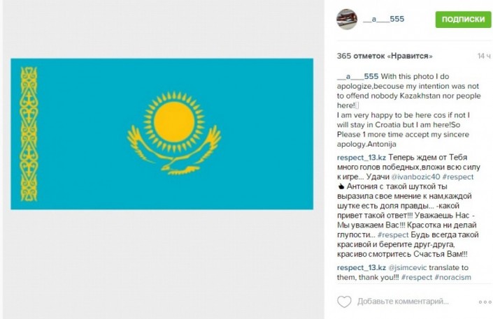 "Этим фото я еще еще раз хотела бы попросить прощения. Я не хотела обидеть Казахстан и жителей этой страны - это не было моей целью. Мне очень нравится бывать в вашей стране, потому что именно здесь и в Хорватии я провожу большую часть времени. Поэтому, пожалуйста, еще раз примите мои искренние извинения. Антония", - написала девушка Божича в Instagram, опубликовав фото флага Казахстана. Подробнее об этом можно прочитать здесь.