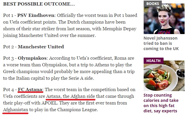 Известная британская газета Independent допустила ошибку в статье о жеребьевке группового этапа Лиги чемпионов УЕФА, назвав ФК "Астана" афганским клубом, передает корреспондент Tengrinews.kz.