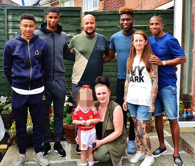 Эшли Янг, Джесси Лингард, Маркус Рэшфорд и Тимоти Фосу-Менса у постели умирающего болельщика. © facebook.com/kayleigh.carson