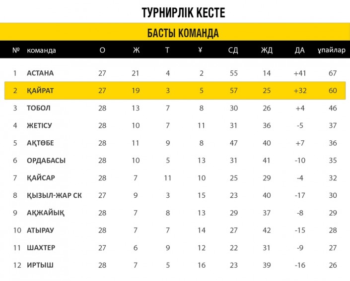Турнирная таблица КПЛ после 28-го тура