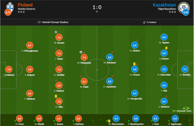 Сборная Казахстана получила за игру оценку 6,43, тогда как финны - 6,73.