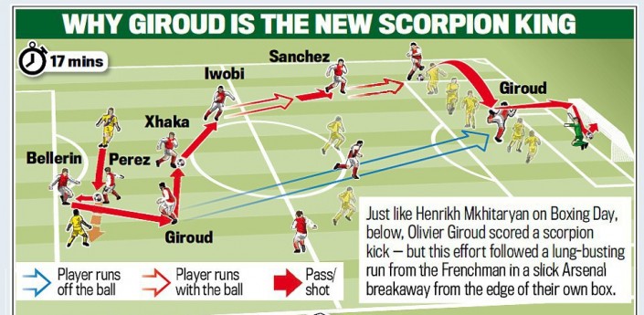 Невероятный удар пяткой через себя удался форварду на 17-й минуте матча, когда Жиру откликнулся на передачу чилийца Алексиса Санчеса. Мяч влетел в ворота рикошетом от перекладины.