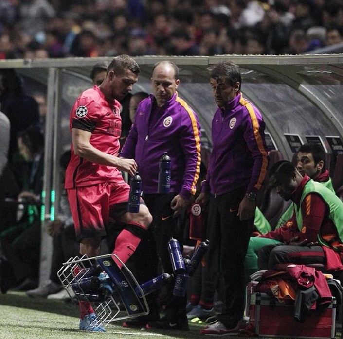Форвард турецкого "Галатасарая" Лукас Подольски пнул ящик с водой после замены в матче второго тура группового этапа Лиги чемпионов с "Астаной", сообщают Vesti.kz.