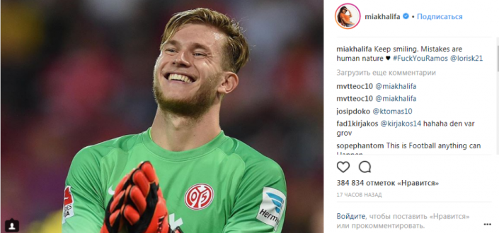 На своей странице в Instagram девушка опубликовала его фотографию с подписью "Продолжай улыбаться. Ошибки - это человеческая природа". При этом свой пост Миа сопроводила оскорбительным хэштегом в адрес капитана "Реала" Серхио Рамоса.