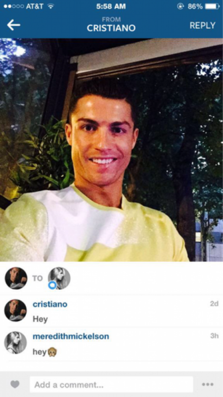 Роналду написал Микельсон в личку в Instagram, прикрепив свою фотографию. После выяснилось, что Мередит всего 16 лет. Игроку "Реала" пришлось прекратить общение с девушкой, в том числе после того, как Мередит заскринила переписку и выложила в Twitter с подписью: "Не знаю, как это произошло, но я не против". Правда, позже пост был удален.