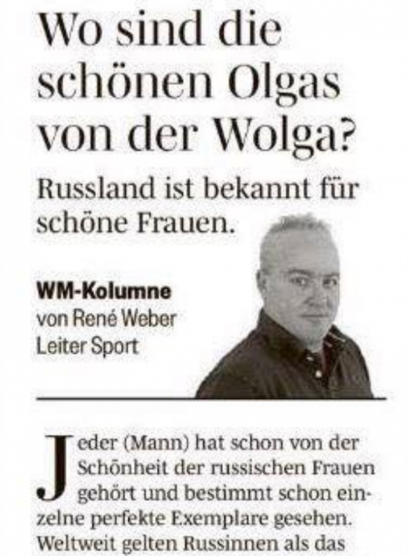 Швейцарский журналист Рене Вебер, прилетевший на чемпионат мира по футболу, практически не встретил в России красивых девушек. Об этом он написал в статье для издания Die Südostschweiz