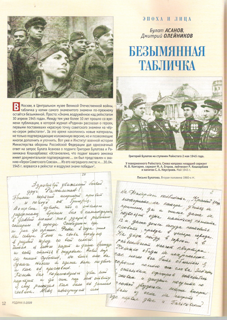 И мы химическим карандашом, который у меня оказался в кармане, тут же, под мостиком лежа, написали: "674 полк, 1 б-н". И вывели свои имена: "Л-т Кошкарбаев, кр-ц Булатов". Мы тут пролежали до темноты. Потом началась артподготовка, и с первыми же выстрелами ее мы подбежали к Рейхстагу. Я поднял Булатова, придерживая его за ноги, и тут, на высоте второго этажа, установили флаг…" По словам Кошкарбаева, 260 метров открытого пространства они вместе с Булатовым ползли более семи часов.