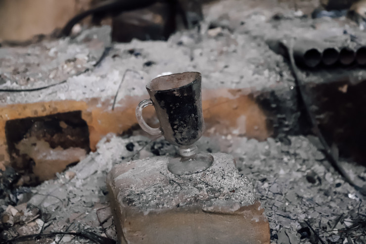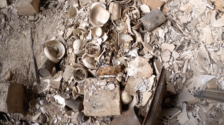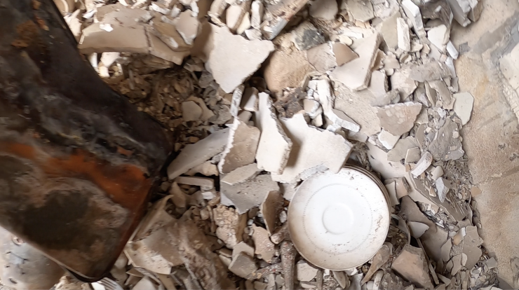 На самом верхнем 6-м этаже располагалась приемная акима города. В кабинете акима еще не все успели убрать. На пепелище можно заметить остатки посуды и внутренного убранства. Здесь, кажется, уцелели только эти тарелочки.