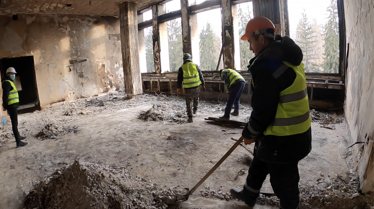 Говорят, что рабочим, которые сейчас расчищают здание, платят по 9 тысяч тенге в день. В Сети можно увидеть объявление о наборе добровольцев.
