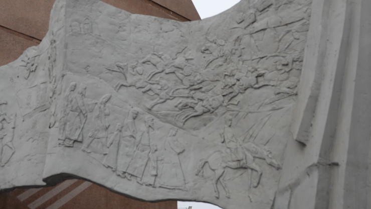 Сондай-ақ, композицияға қолымен ұшуға дайын тұрған әйелдің мүсіні енгізілген. Ол оң қолына татулыққа шақыру нышаны іспетті орамал ұстаған. Ал сол қолында бостандыққа талпынысты, ұшу белгісін білдіретін, қанатын жайған құсты ұстаған. Ескерткіштің үшінші бөлігі - оюлы панно.