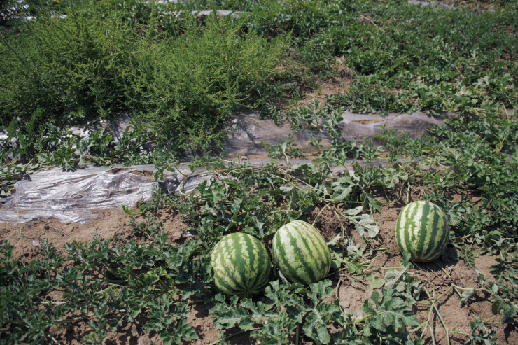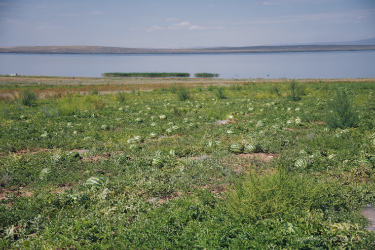 Двигаемся дальше вдоль берега и находим то, за чем мы приехали в эти края, - арбузная плантация. Для тех, кто видел полосатые плоды только на полках магазинов, показываем, как их выращивают.