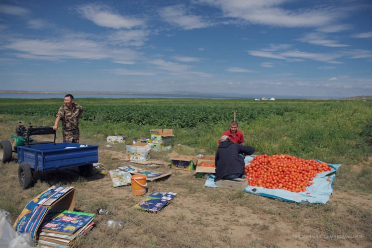 После парома едем вдоль берега в сторону Курчума. Замечаем поле, на котором собирают помидоры.