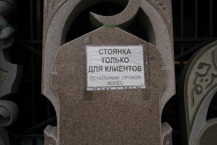 Рядом на светлой могильной плите еще раз, будто уточнение: "Стоянка только для клиентов. Остальным - прокол колес".