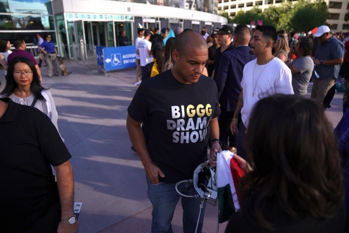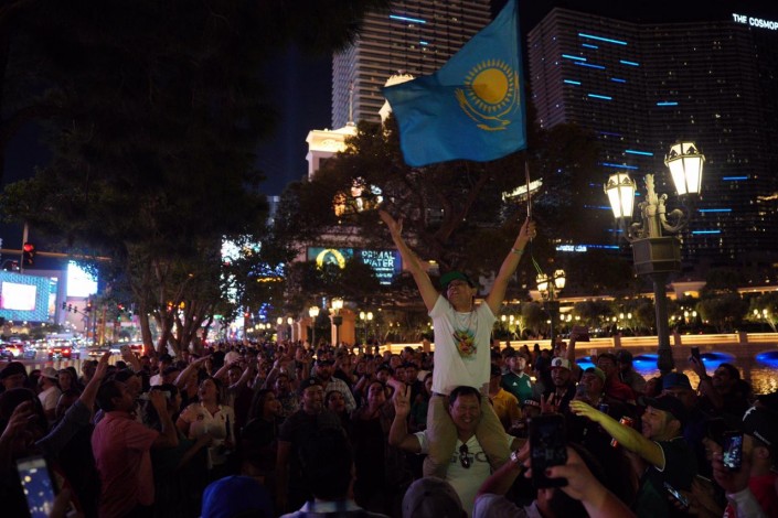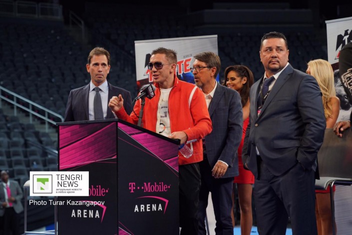 Перед началом боя у арены T-Mobile в Лас-Вегасе собирается множество болельщиков. Повсюду можно было увидеть казахстанский флаг.
