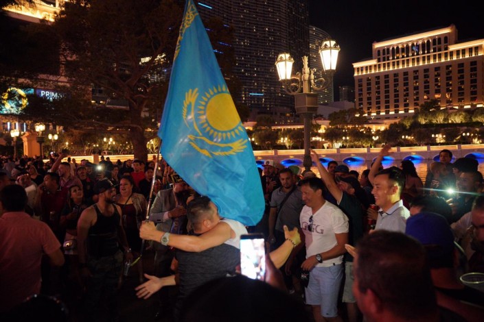 На улицах Лас-Вегаса уже темно. Болельщики из Казахстана собираются вместе. К ним даже присоединяются мексиканцы.