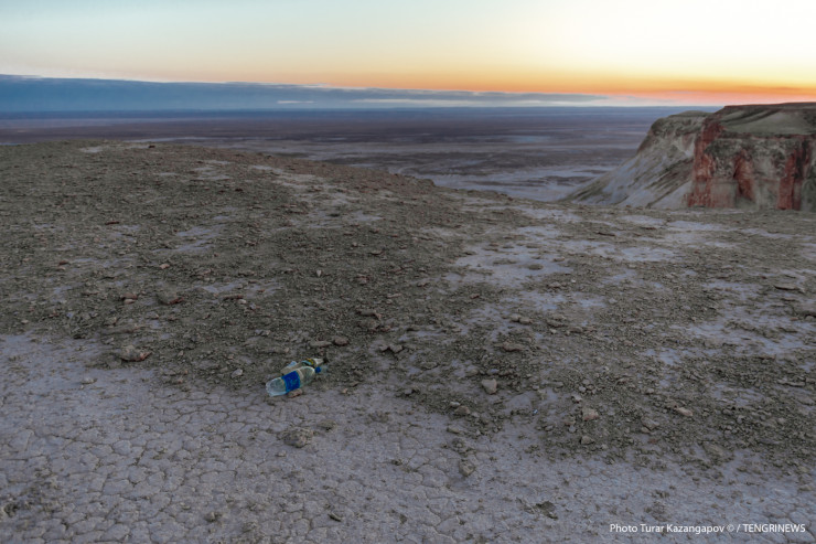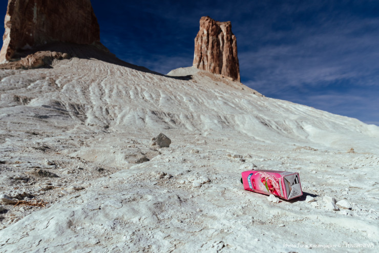 Рядом с Бозжырой мы находим много следов человеческой жизнедеятельности: стакан из-под кофе, упаковка от сока, медицинская маска. Ранее сообщалось, что за прошлый год это место посетили порядка 5000 человек. Еще больший бум планируется в этом году. Но пока в Бозжыре не сезон, поток людей ожидается с апреля.