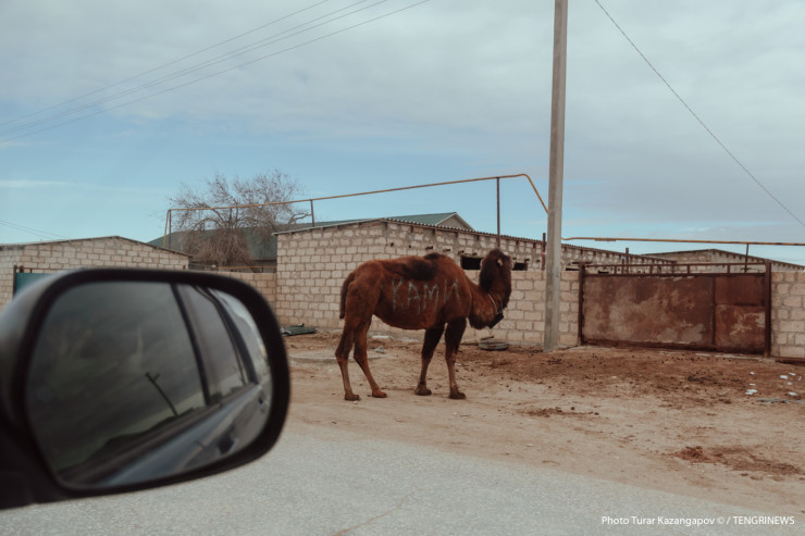 По дороге нам встречаются нефтяные качалки, верблюды и один поселок - Сенек.