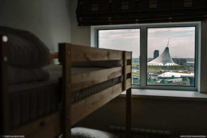 Как рассказал администратор, этот хостел работает недавно и предоставляет широкий спектр услуг. Здесь можно снять на ночь спальное место с видом на Хан-Шатыр за 3500 тенге, а также можно и заселиться сюда на месяц за 45 000.