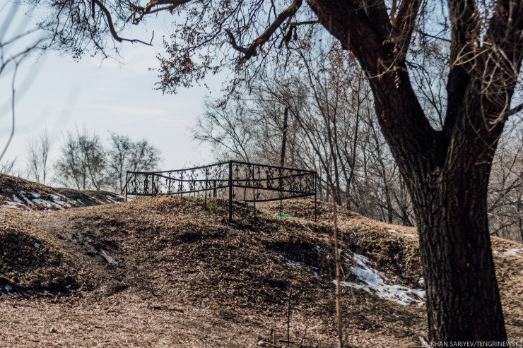 Вообще, сейчас мы с вами стоим на кладбище. Эта часть была мусульманская, а та часть, где поле футбольное, - православное. Раньше здесь была маленькая часовенка, 3 на 3 метра. Я когда заходил туда, там такой трепет был. А вон, видите, где девушки сидят, там бугорок, так вот там в 1932 году были похоронены 2500 - 3000 детей, это когда голод был. Бугор здесь вырыли по весне, чтобы была одна общая могила. А вот там внизу дорогу видите? Там дувал. Под этим дувалом от 500 до 700 взрослых лежали, умерших на улице. Все эти люди убегали от холода, голода, местные, конечно, помогали, но всем не поможешь. Мой отец и еще ветераны войны в 1989 году писали в ЦК Компартии Казахстана, что здесь надо памятник, знак поставить, еще что-то, но пришел ответ: официальных данных о массовых захоронениях нет, ведь эти цифры всегда скрывали, но мы-то, местные, знали об этом. Это не легенда, все было на глазах у моего отца.