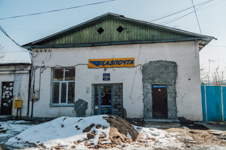 А вот еще одно старинное здание. Старожилы говорят, что этому отделению "Казпочты" уже больше 55 лет. Мы заглянули внутрь, но там среди пыли и краски сидели лишь рабочие.