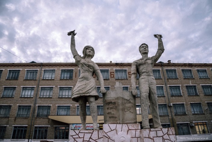 При въезде в поселок нас встречают две каменные статуи - юноши и девушки - возле местного сельскохозяйственного колледжа. На здании заметна надпись "1965 год".