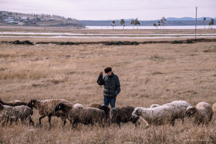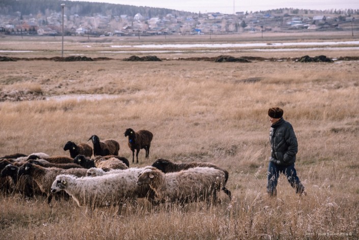 Мы уже выезжали из поселка, когда увидели местного жителя, который пас баранов. Фотограф остановился, чтобы сделать несколько снимков.