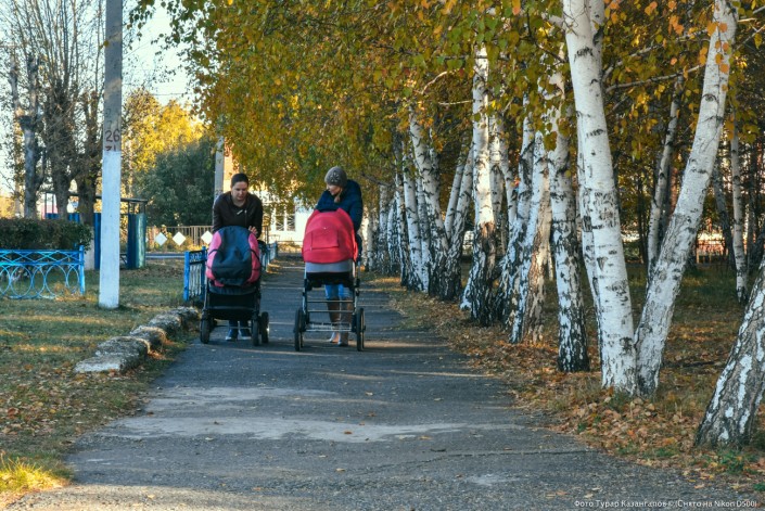 Молодые мамы неторопливо прогуливаются с детьми, провожая последние солнечные осенние деньки.
