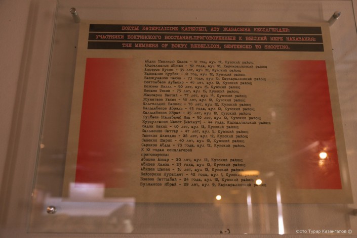 Сохранился список осужденных участников этого восстания. Среди тех, кого приговорили к высшей мере наказания расстрелу, числятся аксакалы, одному из которых на тот момент было 78 лет. Кроме того, к пяти годам лишения свободы был приговорен 16-летний юноша. "За то, что он выразил недовольство той системой, которая пришла к нему домой и насильно изымала его последний хлеб", - комментирует сотрудник музея.