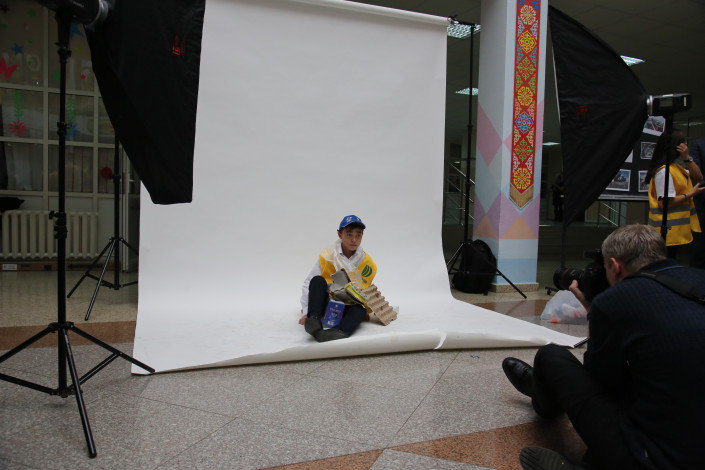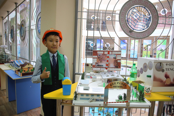 Юные ученики также продемонстрировали свои поделки."Это пластикоперерабатывающий завод, который я хочу открыть рядом с Нур-Султаном. Этот макет мы с мамой сделали. Мы должны заботиться о нашей природе и должны создавать предприятия для этого", - рассказал ученик 4-го класса Расул Шагеров.