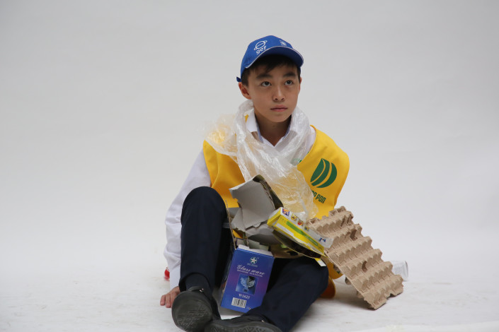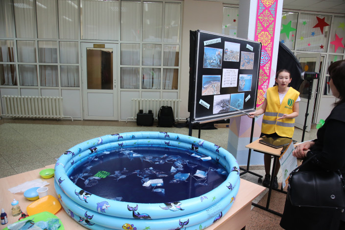 А здесь ученики метафорично показали загрязненный Мировой океан в виде бассейна с мусором. "Мы демонстрируем последствия выбрасывания мусора в океан. Пластик очень долго разлагается и остается на поверхности воды. И за все это загрязнение отвечает человек, он это делает", - считает ученик 11-го класса Алишер.