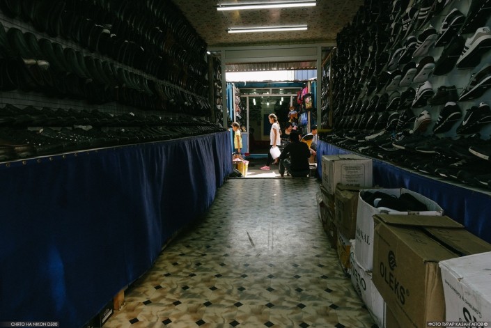 "Кто-то говорит, что у нас обувь дорогая, кто-то - дешевая", - рассказывает нам одна из продавцов. "Обувь от 2 000 тенге", - слышим мы из соседнего контейнера.