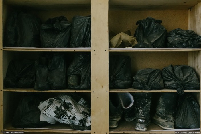 Зайдя внутрь, в коридоре мы заметили большое количество мужской зимней обуви, упакованной в пакеты.
