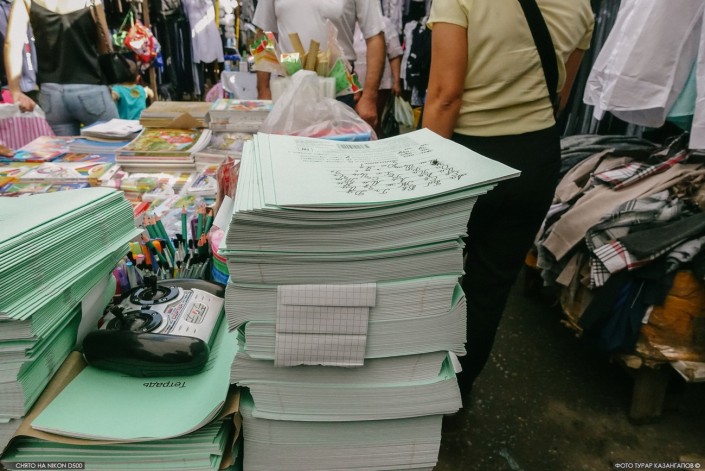 На прилавках рынка в эти дни обилие бантов, белых рубашек и школьных принадлежностей. Родители закупают для детей школьную форму, рюкзаки, тетради.
