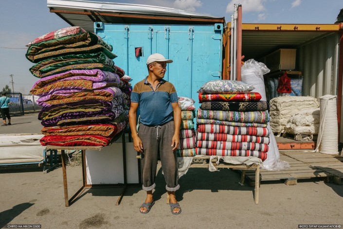 "Курак корпе (традиционное казахское одеяло, сшитое из разноцветных лоскутков - прим. автора) для келин", - зазывает одна из продавщиц. Здесь продают казахские национальные одеяла, подушки и матрацы для дома.