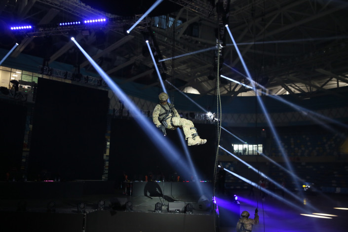 Который продолжился их "спасением". Причем спецназ спустился буквально с потолка Дворца единоборств Jekpe Jek: так свое мастерство показали реальные бойцы службы "А" КНБ.