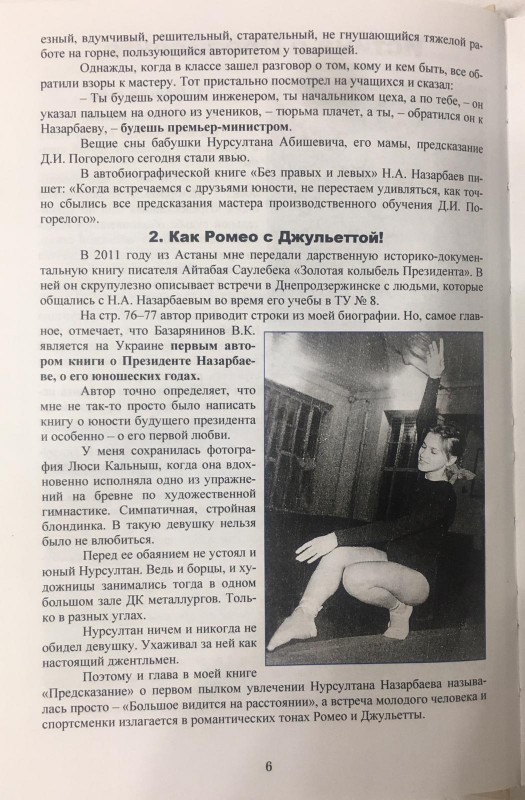В самом начале этой книги есть глава "Как Ромео с Джульеттой!", в ней речь идет о Люсе (Людмиле) Кальныш. Той самой девушке, с которой дружил Назарбаев, будучи студентом в Днепродзержинске.
