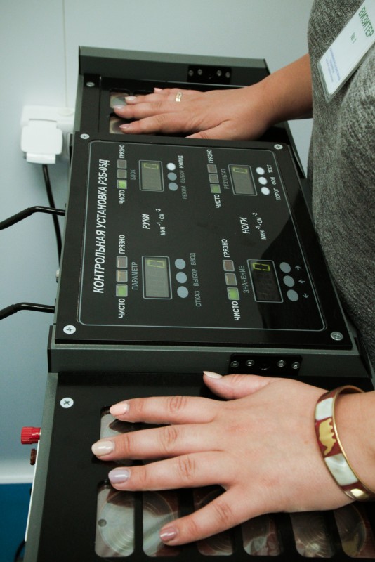 Покидая помещения, мы пройдем обязательную проверку на контрольном дозиметре. Аппарат напоминает эллиптический тренажер, имитирующий езду на лыжах. Ноги - в пазы, руки - на панель. Результат на табло говорит, что у всех по нулям.