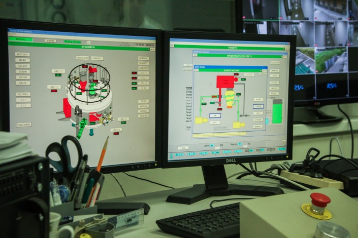 Мы заходим в пультовую циклотронной установки - здесь все выглядит как в фильмах: много экранов, много датчиков, даже большая красная кнопка есть. Она нужна для экстренного выключения системы.
