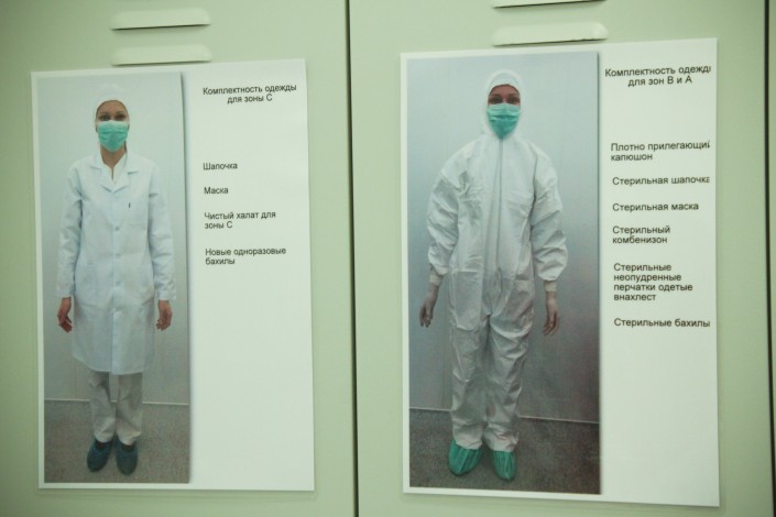 Мы следуем в одно из шести помещений, где расположены "горячие" камеры. По пути будет еще один саншлюз, где обязательно надо надеть халаты, бахилы и шапочки. Сейчас в корпусе идут ремонтные работы, поэтому нам повезло попасть сюда. В штатном рабочем режиме это было бы невозможно.