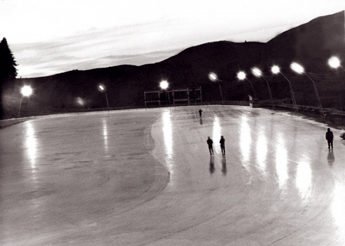 Каток в то время представлял собой залитую площадку с несколькими трибунами. Фото начала 1960-х.
