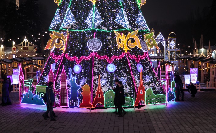 Елка украшена в национальном стиле, ее окружает декоративное световое ограждение в виде достопримечательностей мира.