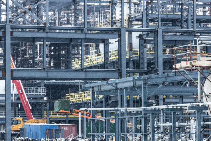 Это будущая установка по производству пропилена. Технологи ее называют установкой дегидрирования пропана. Сырьем является пропан. Он будет поставляться железной дорогой и перерабатываться на установке с получением пропилена. Сейчас ведется монтаж технологического оборудования.