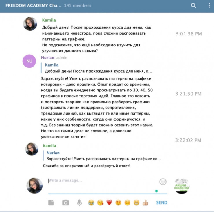 Во время прохождения обучения я также активно участвовала в закрытом чате по курсу "Технический анализ basic", где слушатели могут познакомиться, задать интересующие вопросы, поделиться опытом, обсудить тренды и найти единомышленников.