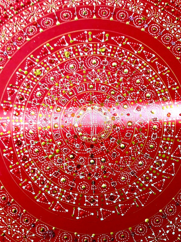 Художник Санжар Жубанов, известный тем, что возрождает древнее искусство петроглифов, представил свое абстрактное видение будущего. На конкурс он прислал графический рисунок Солнца, нарисованный точками гелевой ручкой на красной бумаге.