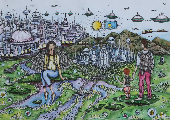 Студентка из Семея Полина Горяева видит будущий Казахстан технологически развитым и при этом сохранившим первозданную природу. Ее работа называется "На крыльях будущего". У каждого жителя страны - собственные крылья, с помощью которых они могут летать. А если посреди полета появилось желание отдохнуть - в их распоряжении парящие в воздухе зеленые островки, на которые можно опуститься для отдыха. С них открывается вид на огромный цветущий город будущего.