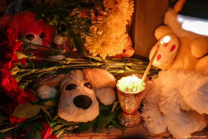 Забор посольства России на глазах превращался в стену скорби. Люди продолжали нести цветы, игрушки, зажженные свечи.